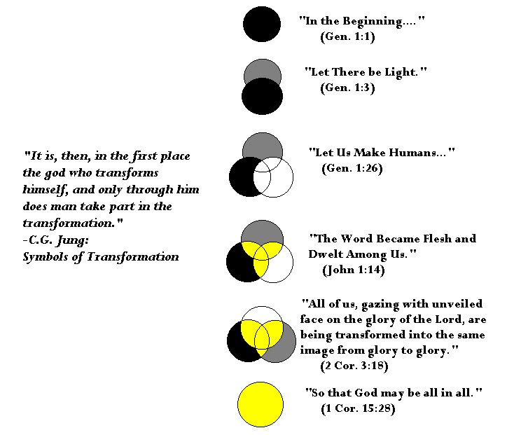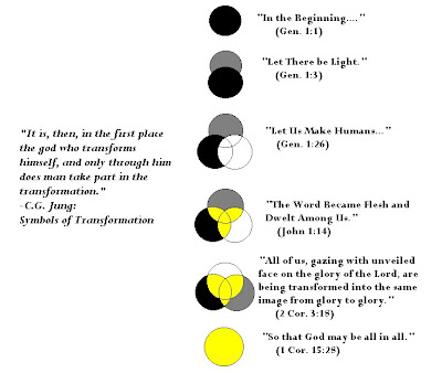 The above illustrations depict the process of "divinization" or "theosis" in the life of the human person, specifically, one who lives a Christ-like life. Before we consider what each sequence in the top illustration signifies, please go to the bottom picture, place your mouse arrow on the black circle, and click (the picture is an animated file and will depict the above drawing in a more dynamic manner). Now let's move on to an explanation of the illustration and the animated version of it.
